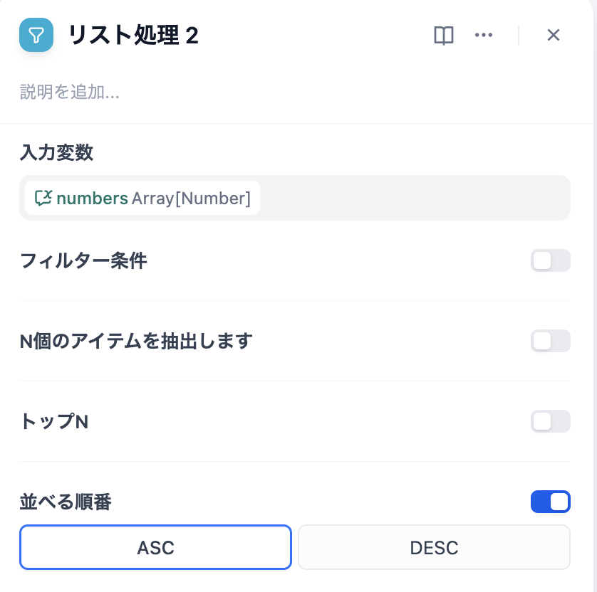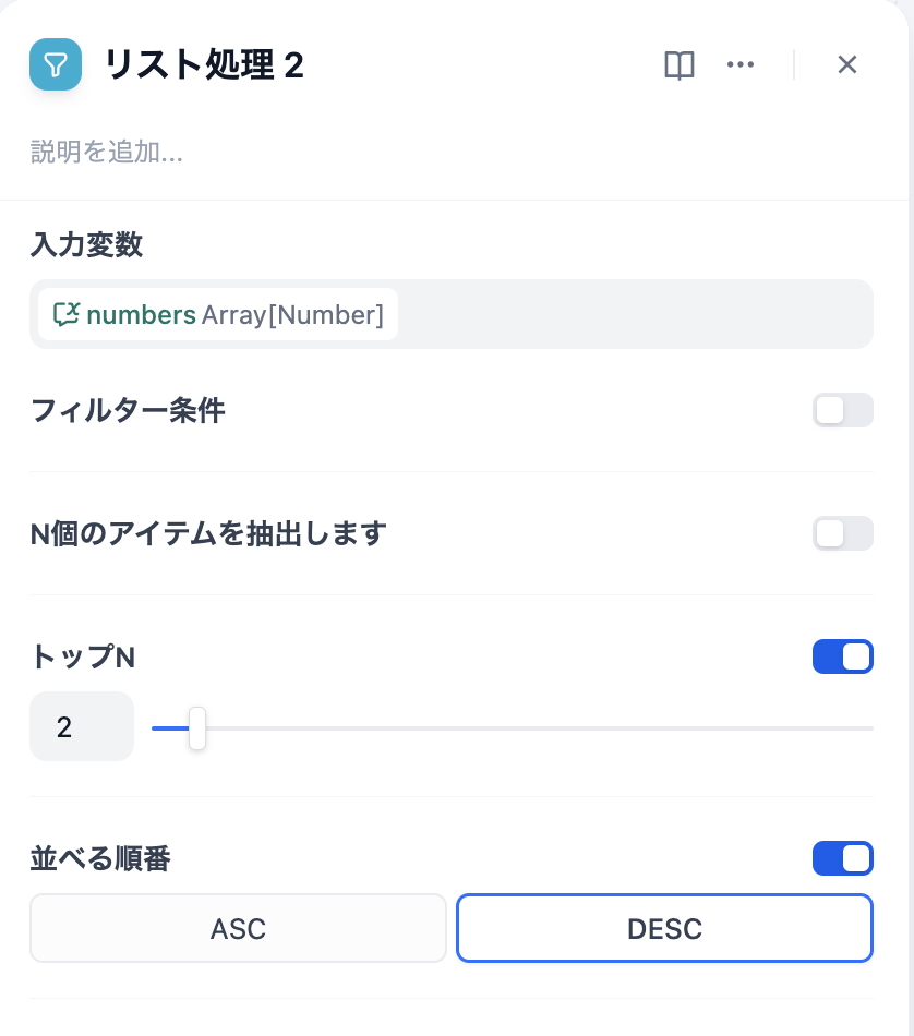室谷先頭N件の取得は1〜20の範囲で設定できます。フィルタリングとソートの後に適用されるので、「条件に合うものを並び替えた上で上位N件だけ使う」という処理ができます。