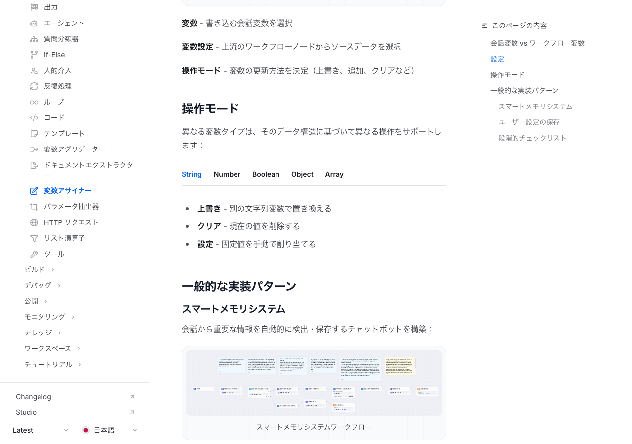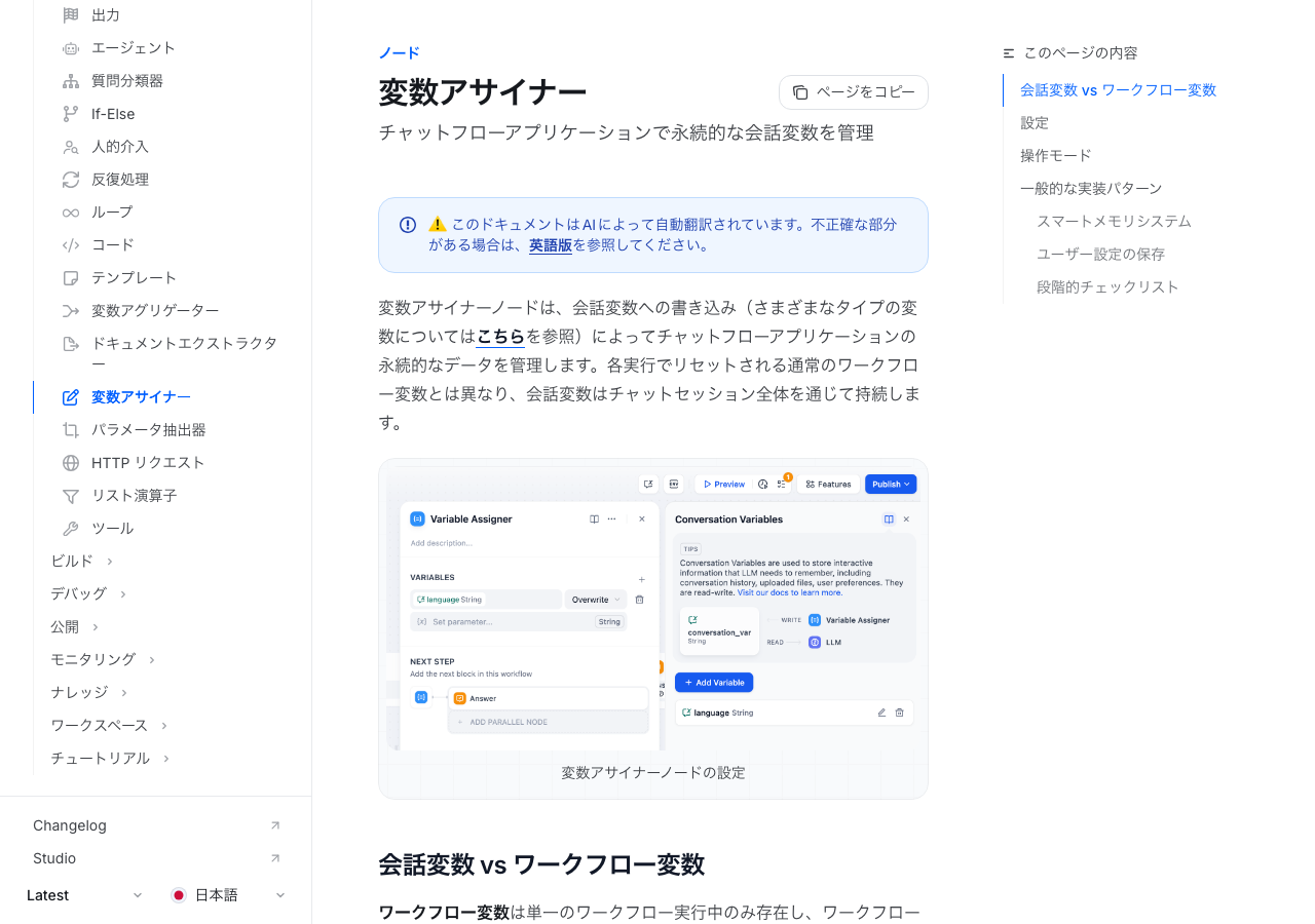 室谷ワークフローではなくチャットフローを使っているかどうか、これも確認ポイントですね。変数アサイナーは公式ドキュメントにも「チャットフローアプリケーションで永続的な会話変数を管理する」と明記されていて、通常のワークフローでは会話変数の概念自体がありません。