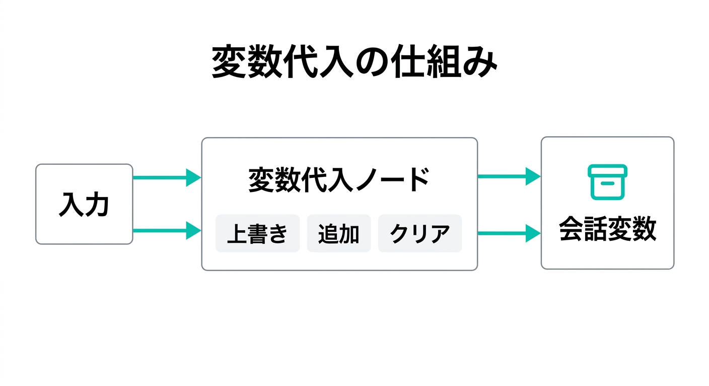 室谷これは用途がまったく違います。変数代入ノードは「会話変数への書き込み」が目的。