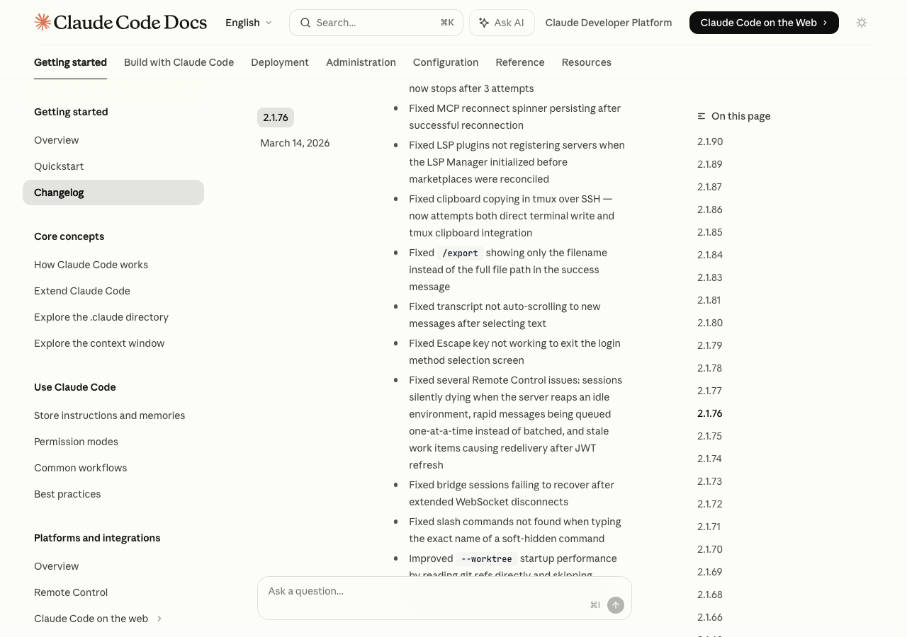 室谷公式の changelog は にまとまっています。最新の 2.1.90(2026年4月1日)ではこんな変更がありました。