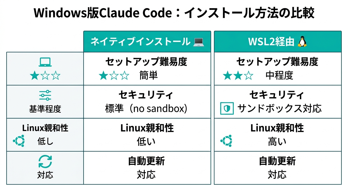 テキトー教師WSL2だとサンドボックス機能が使えてセキュリティが強化されます。企業環境でClaude Codeを使う場合は、WSL2を使う方が安心です。