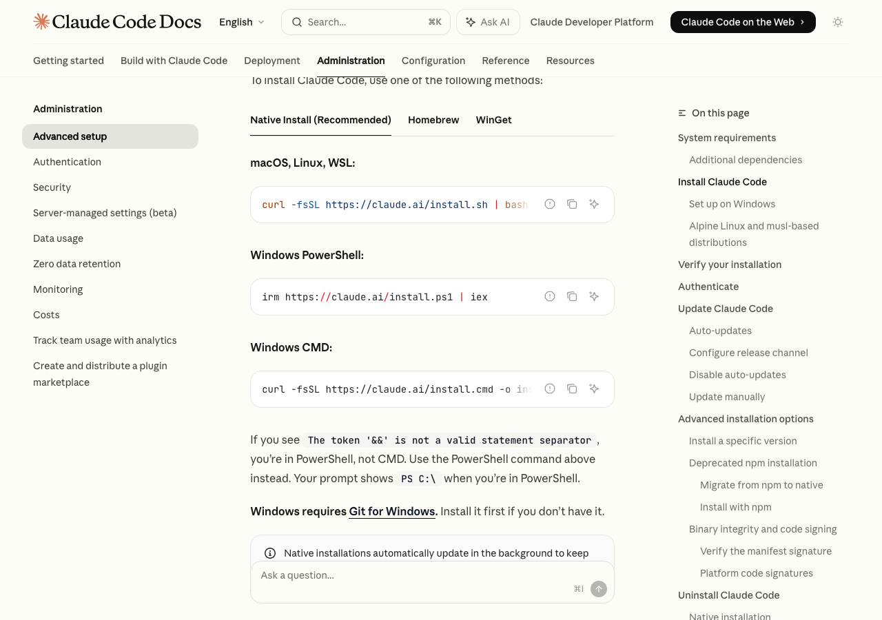 curl -fsSL https://claude.ai/install.cmd -o install.cmd && install.cmd && del install.cmd